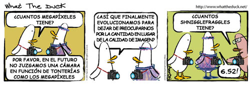 El otro día dejaba Francisco una genial viñeta sobre un tema de actualidad: la medición de la calidad de una cámara digital según sus megapíxels. Pero esto es lo que pasa cuando nos la mete doblada el mercado. Menos mal que ahí están los patos amantes de la fotografía para darle un toque de humor al tema. Geniales. Los he visto en Backfocus una web realmente buena sobre fotografía a la que le sigo la pista desde sus comienzos. Ah! los patos están en What the Duck [en] 😉 (Algunos traducidos al español).